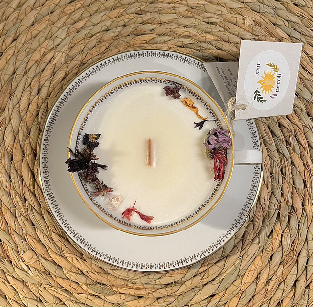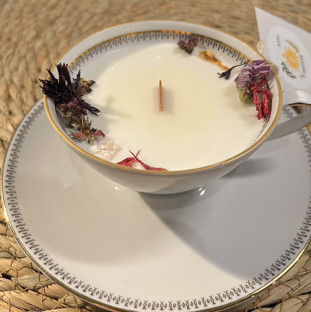 Bougie artisanale unique coulée et décorée à la main - Fleurs séchées cueillies à la main en Belgique de manière responsable.